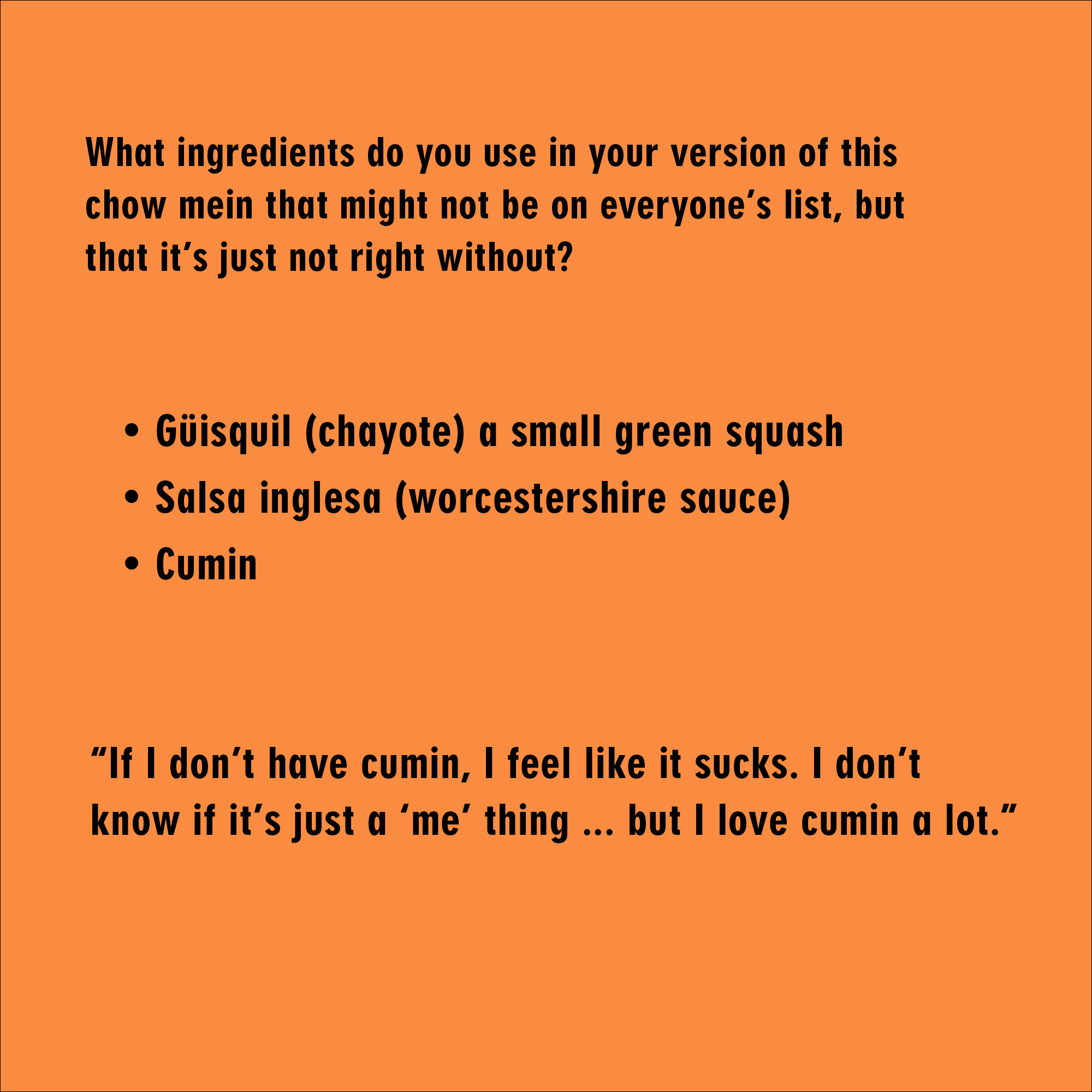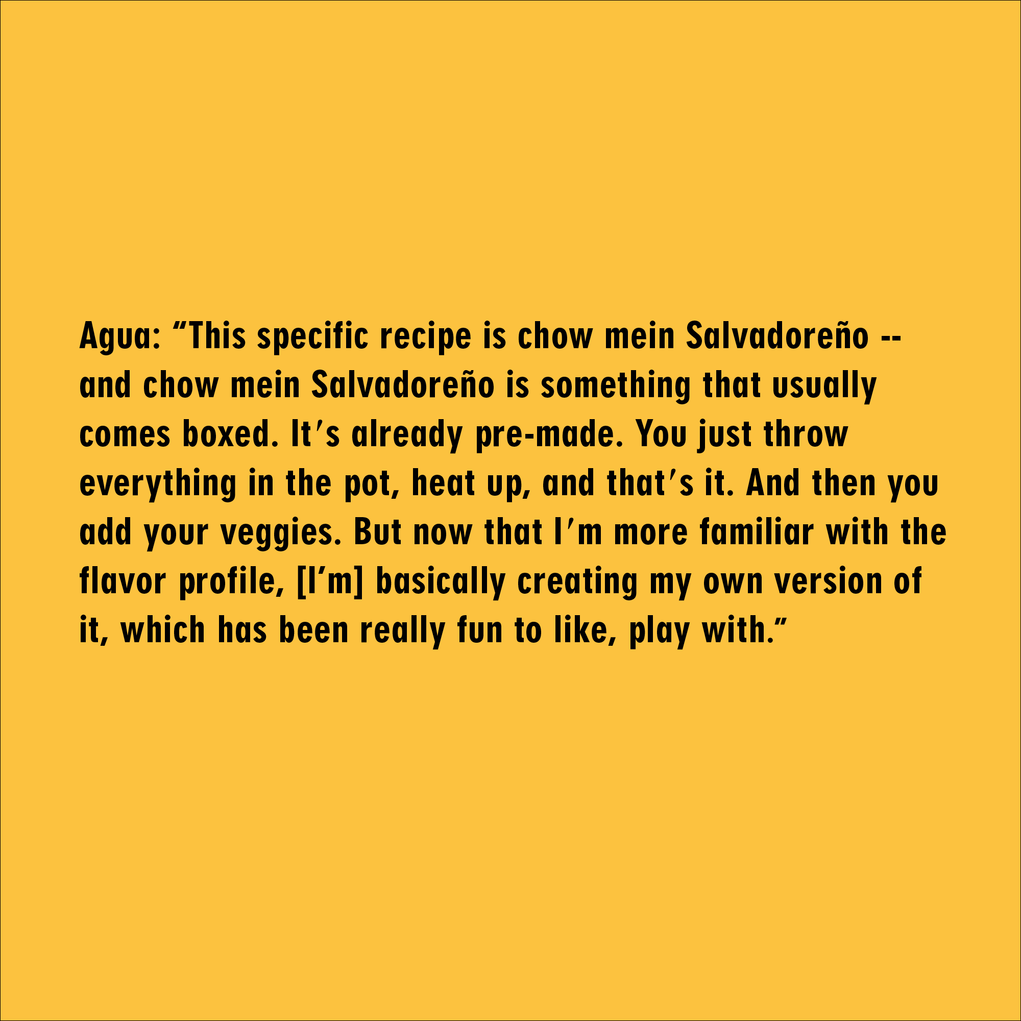 Agua (they/them/theirs) is the chef and owner of Amanos.LA, a popup and private catering business based in Los Angeles. They also have experience cooking in restaurant kitchens across LA. As chef Agua prepares a chow mein Salvadoreño for us to share together in the living room, I ask them some questions about their recipe and the memories associated with the dish. Their dog, Lucky, keeps close tabs on us while thinly sliced onions and güisquil sizzle on the stovetop.